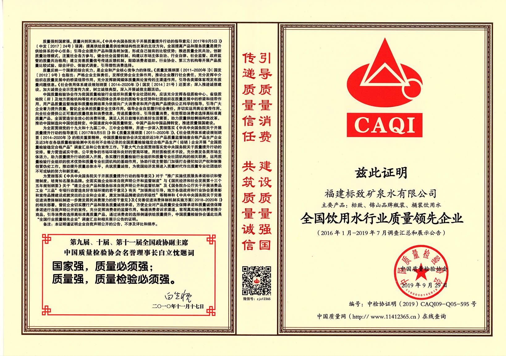 • 2020-03-252019年9月,標致公司榮獲“全國飲用水行業質量領先企業”稱號